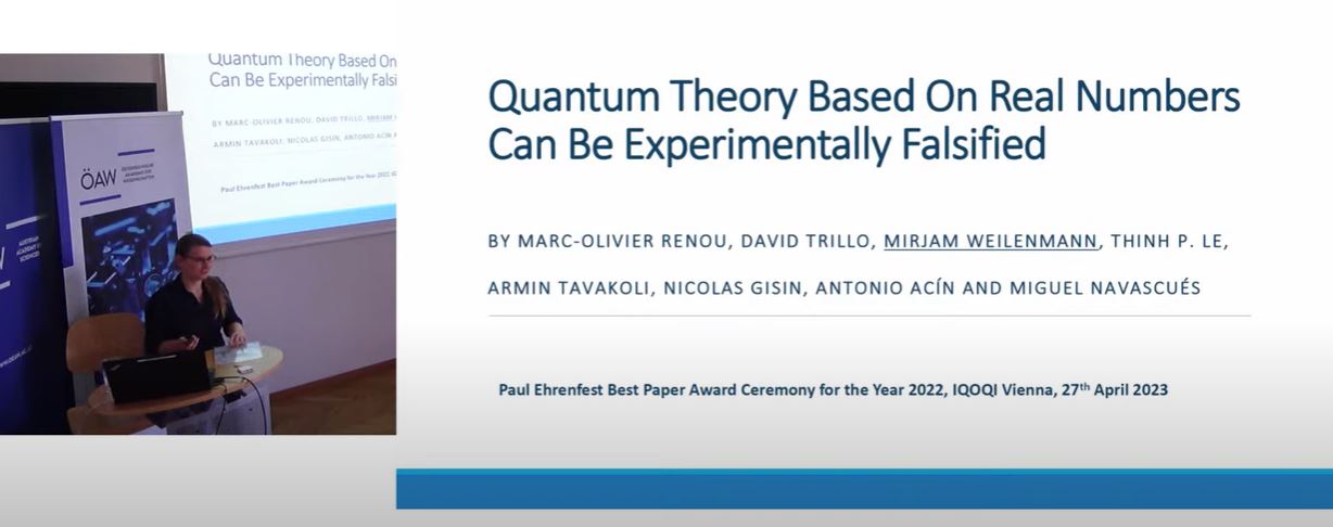 The committee awarded the prize to Renou et al. for "proving that quantum theory based on real numbers and quantum theroy based on complex numbers give rise to different predictions and identifying explicitly a Bell-type experimental scenario where this happens, hence opening the possibility for an experimental falsification of quantum theory based on real numbers."