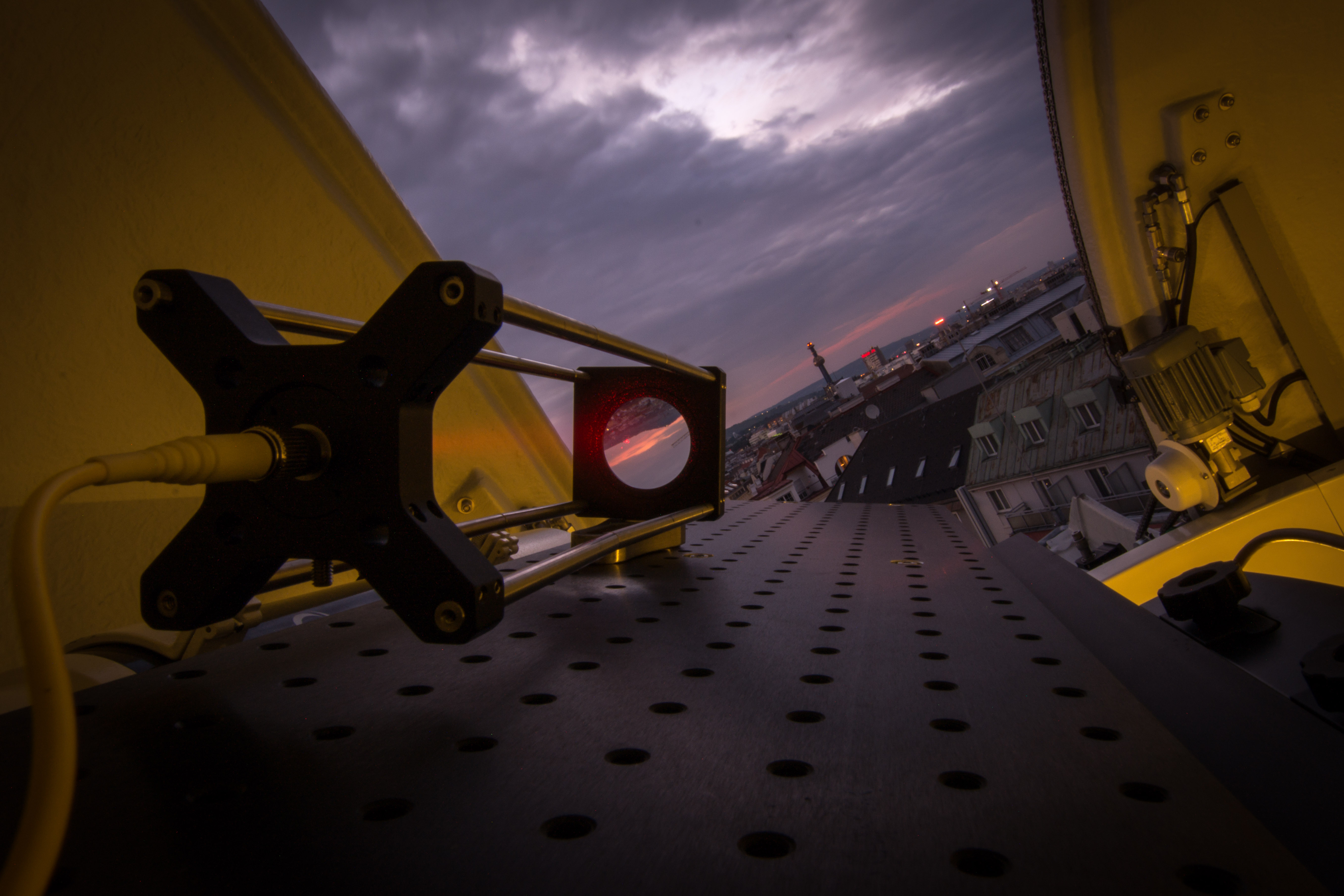 Sendestation mit rotem Justagelaser im Hedy Lamarr Teleskop am Dach des Instituts für Quantenoptik und Quanteninformation der ÖAW mit Blick in Richtung der Empfangsstation im Norden Wiens. © IQOQI/ÖAW