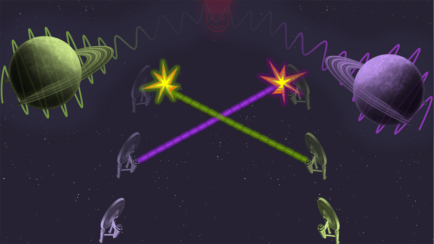 To illustrate what happens, imagine a pair of starships training for a mission. They are asked to fire at each other at a specified time, and immediately start their engines in order to dodge each other’s attack. If either of the ships fires too early, it will destroy the other, and this establishes an unmistakable time order between the firing events. If a powerful agent could place a sufficiently massive object, say a planet, closer to one ship it would slow down its counting of time. As a result, the ship farther away from the mass will fire too early for the first one to escape.