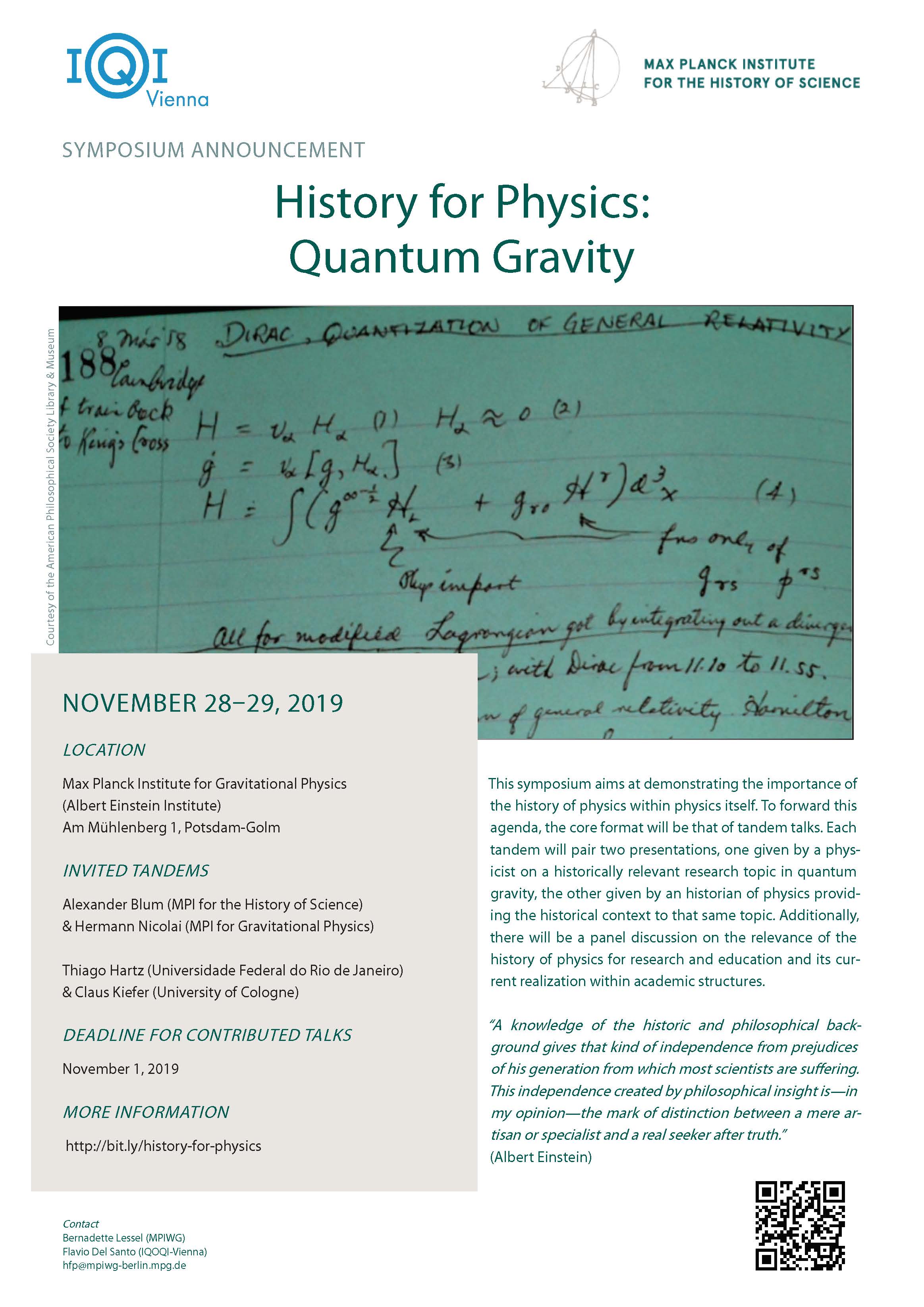 "History for Physics: Quantum Gravity" is the second of so far two scheduled events of this kind. The first, on quantum foundations, was held September 23-24, 2019 at the Faculty for Physics at the University of Vienna.